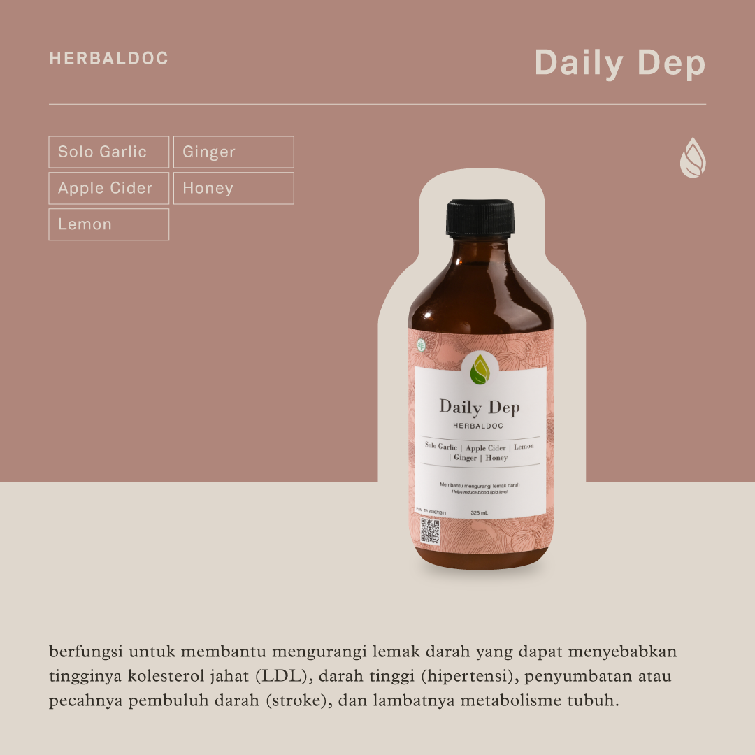 Daily Dep membantu mengurangi lemak dalam darah. Daily Dep dibuat dari bawang putih tunggal dan 5 bahan alami yang mengandung antioksidan tinggi dan membantu menetralkan pH dalam tubuh. Membantu tubuh melawan berbagai macam penyakit. Lemak darah yang tinggi dapat menyebabkan darah tinggi, kolenterol (LDL), penyumbatan pembuluh darah, metabolisme tubuh melambat, dan obesitas.